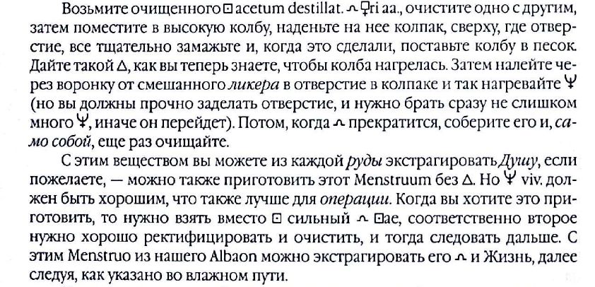И перечитывай её много-много раз, пока не придет понимание. Там всё разложено по полочкам. И не ищи отдельно серу и отдельно ртуть, ибо исходная материя - это уже сера и ртуть вместе. В этой главе эта материя описана прямым текстом. Преврати её в соль (той штукой, что придает телам устойчивость) и подвергни объемной конденсации в процессе пиролиза, по всем философским правилам. Перегонять ничего не нужно, кроме философского растворителя, да и тот можно получить в гантеле, сделанной из двух плоскодонок. Уверен, ты бы и до этого не додумался.
